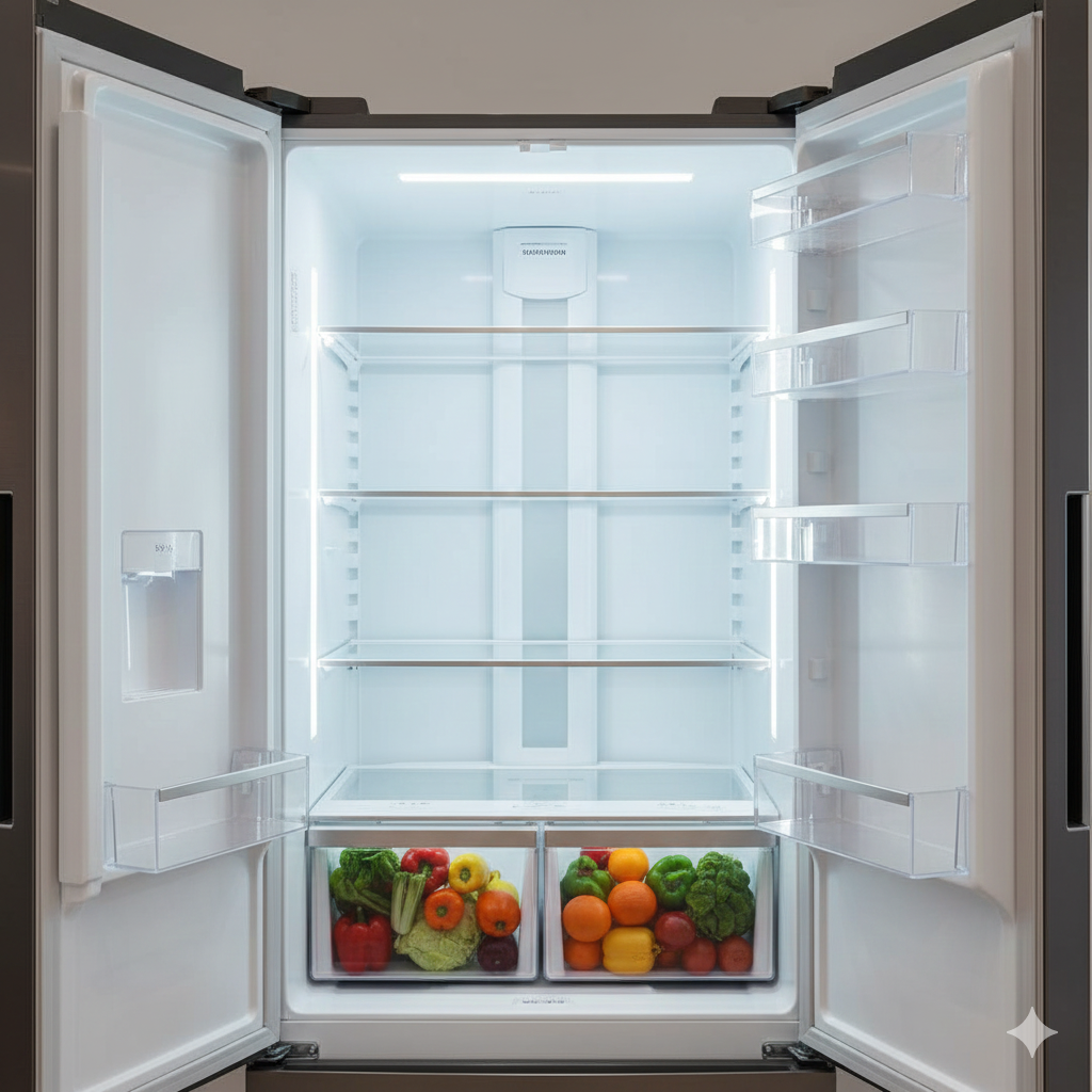سعة 500 لتر مصممة بذكاء لتوفير أقصى مساحة تخزين. تحتوي الثلاجة على أرفف زجاجية قابلة للتعديل، ودرج خاص للتحكم في الرطوبة للحوم والخضروات، بالإضافة إلى إضاءة LED داخلية ساطعة وهادئة لاستهلاك طاقة منخفض.